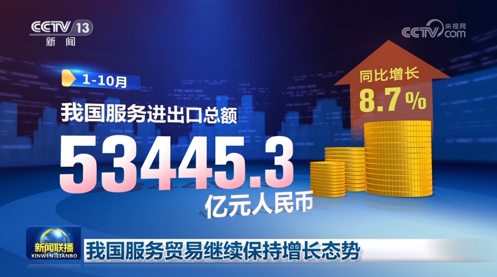 央视网消息(新闻联播):商务部最新公布的数据显示,1—10月,我国服务贸易继续保持增长态势,知识密集型服务贸易占比持续提升,已经成为服务贸易发展的新趋势和新引擎。