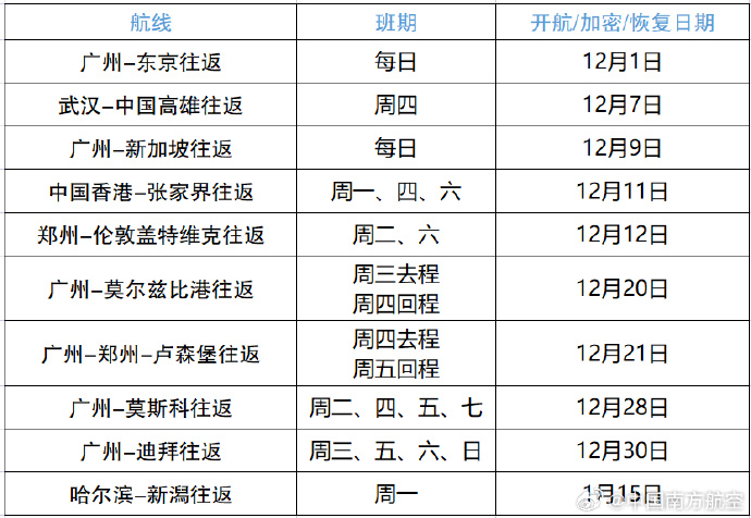 央视网消息:12月2日,@中国南方航空 发文称,为进一步丰富旅客出行选择,中国南方航空将于12月至明年1月,持续新开、复航和加密多条国际及地区航线。