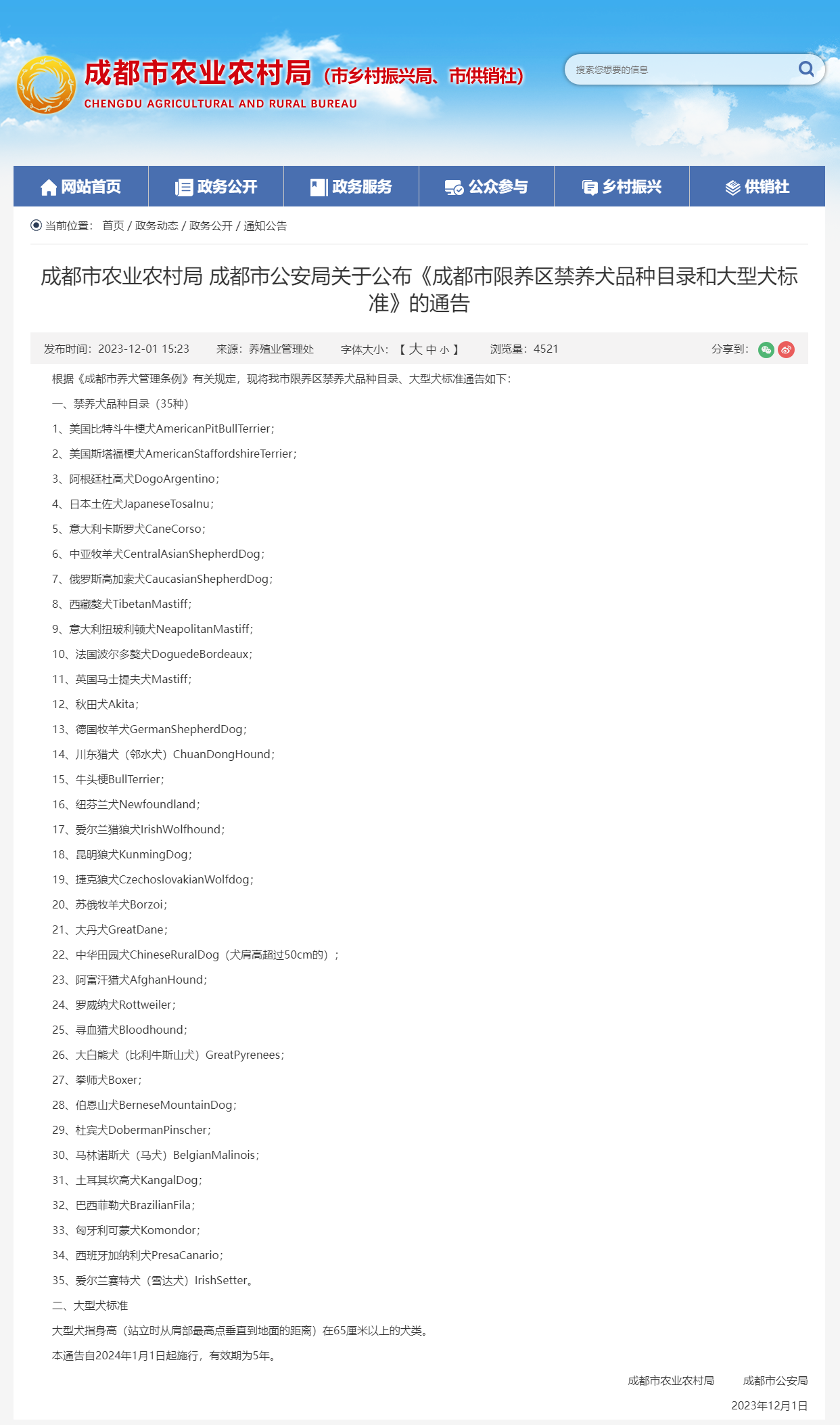 ·《成都市限养区禁养犬品种目录和大型犬标准》发布,明年起施行。