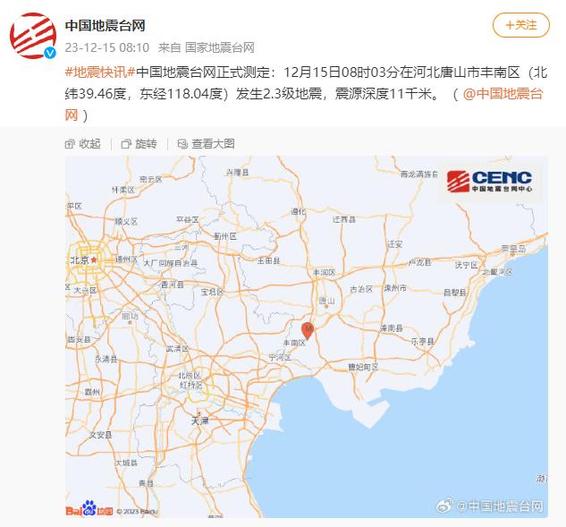 :中国地震台网正式测定:12月15日08时03分在河北唐山市丰南区(北纬39.46度,东经118.04度)发生2.3级地震,震源深度11千米。