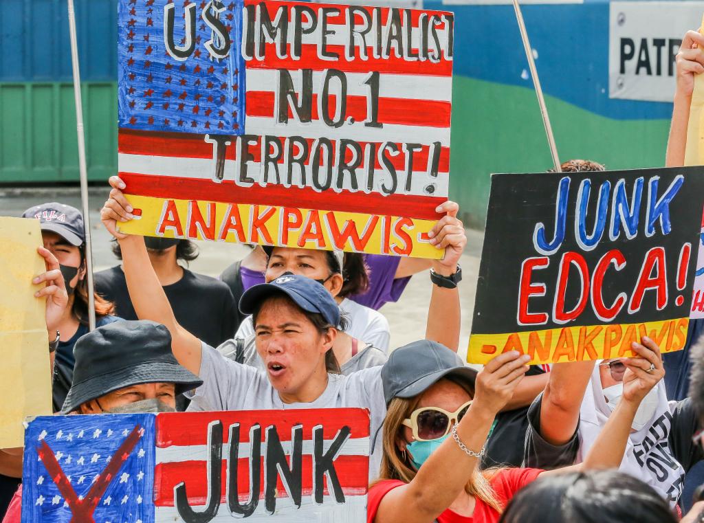 2023年4月11日,在菲律宾首都大马尼拉地区奎松城,民众参加集会活动,抗议菲律宾和美国军方举行联合军事演习。菲律宾和美国军方当天在菲首都马尼拉启动为期18天的2023年度“肩并肩”联合军事演习。新华社发(乌马利摄)