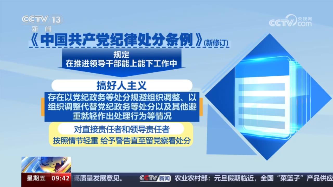 新修订的《条例》规定,在推进领导干部能上能下工作中,搞“好人主义”,存在以党纪政务等处分规避组织调整、以组织调整代替党纪政务等处分,以及其他避重就轻作出处理行为等情况,对直接责任者和领导责任者,按照情节轻重,给予警告直至留党察看处分。