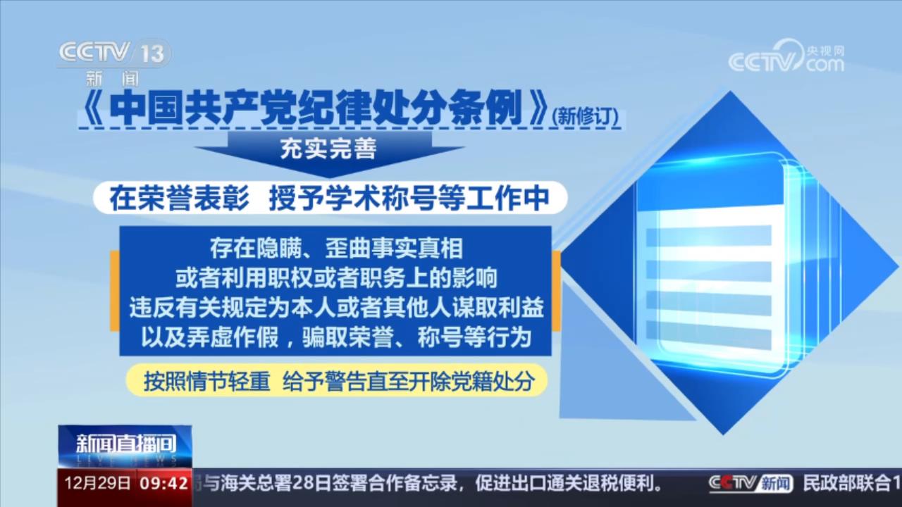 《条例》修订过程中,立足保障人才评价机制的落实,充实完善在荣誉表彰、授予学术称号等工作中,存在隐瞒、歪曲事实真相,或者利用职权或者职务上的影响,违反有关规定为本人或者其他人谋取利益,以及弄虚作假,骗取荣誉、称号等行为,按照情节轻重,给予警告直至开除党籍处分。