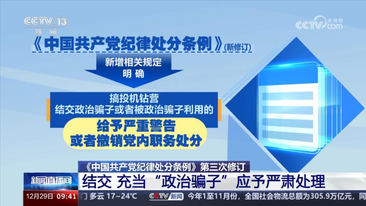 对此,《条例》在修订过程中新增相关规定明确,搞投机钻营、结交“政治骗子”或者被“政治骗子”利用的,给予严重警告或者撤销党内职务处分;情节严重的,给予留党察看或者开除党籍处分;充当“政治骗子”的,给予撤销党内职务、留党察看或者开除党籍处分。