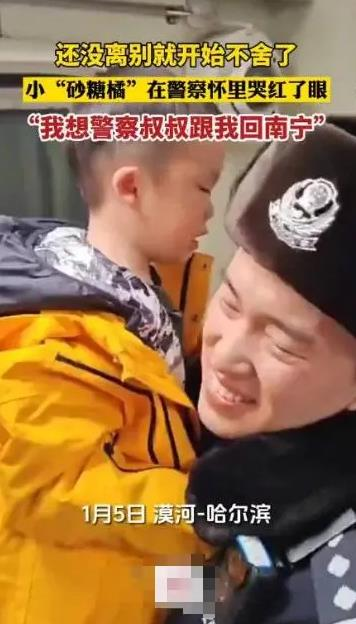 1月5日,从漠河回哈尔滨的雪国列车上,有位“砂糖橘殿下”边哭边抱着警察叔叔不撒手,“我想警察叔叔跟我回南宁。”来自东北警察叔叔的爱,一定是最最暖的吧!