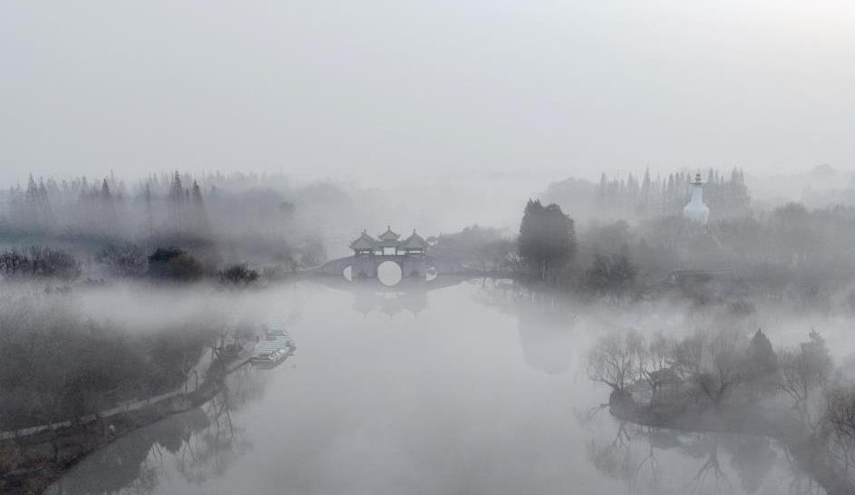 2024年1月6日,江苏扬州,瘦西湖风景区在晨雾中若隐若现,宛如一幅水墨画卷,美不胜收。
