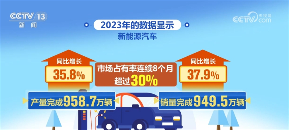 中国新能源汽车也同样领跑全球市场,自2015年起,产销量连续9年位居世界第一。2023年的数据显示,新能源汽车产销量分别完成958.7万辆和949.5万辆,同比分别增长35.8%和37.9%,市场占有率连续8个月超过30%。