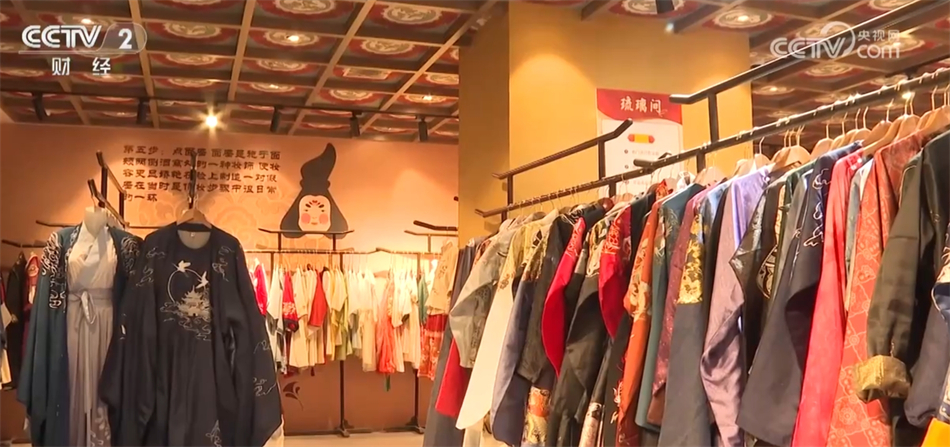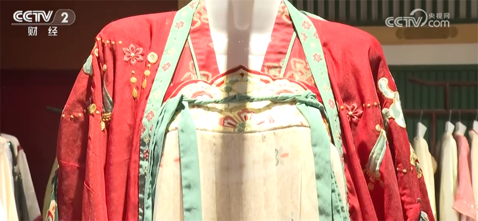总台记者 秦祎:我旁边的这件就是店内最受欢迎的唐装之一——花想容,这件衣服里面是一件唐装的基础款造型齐胸襦裙,披上外披则是贵妃造型,如果担心天气冷可以像我一样加上斗篷。