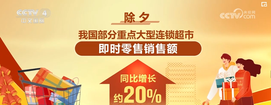 据商务部大数据监测,2024年除夕,部分重点大型超市即时零售销售额同比增长约20%。除夕当天,重点电商平台在线餐饮销售额同比增长40.8%,全国示范步行街客流量、营业额同比分别增长26.9%和21.7%。