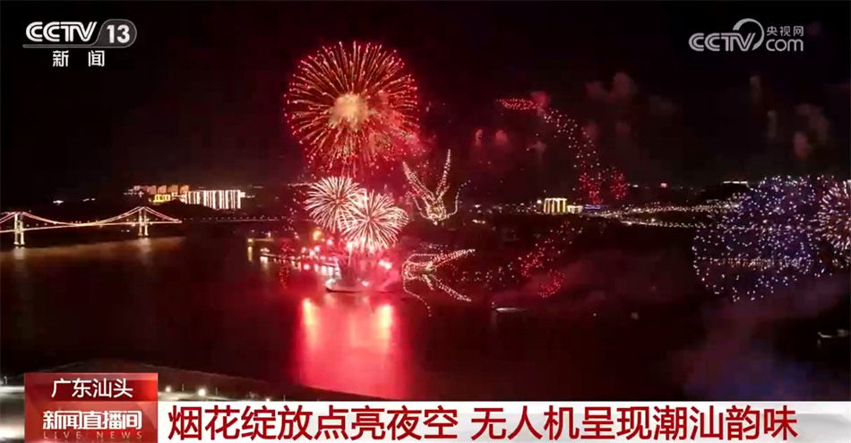 烟花辞旧岁,金龙贺新春。在广东汕头举行的迎新春焰火晚会上,超5万发烟花激情绽放,点亮夜空。3000架无人机在夜空中排列出潮汕英歌舞、潮汕红桃粿等具有潮汕元素的图案,将汕头城市韵味、侨乡文化一一呈现。现场观众纷纷拿起手机,记录这精彩的时刻。