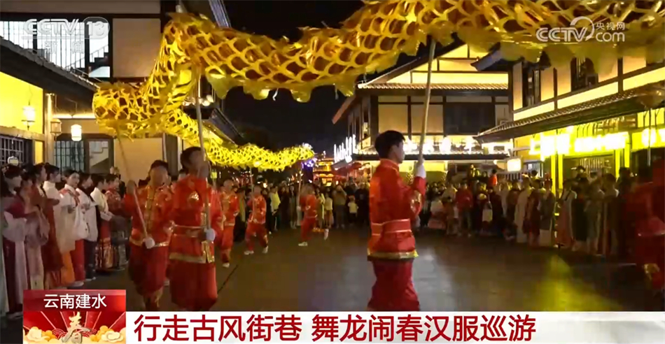 在云南红河州建水县紫陶里汉唐街区,一场舞龙闹春汉服巡游活动拉开了序幕。舞龙队伍一路闪转腾挪,一条黄色长龙奋力舞动,忽高忽低,飘忽飞逸。身着华美汉服的姑娘行走在古风街巷间,一种古朴幽远的韵味扑面而来。市民与游客在感受建水年味的同时,也体验到中华传统文化之美。