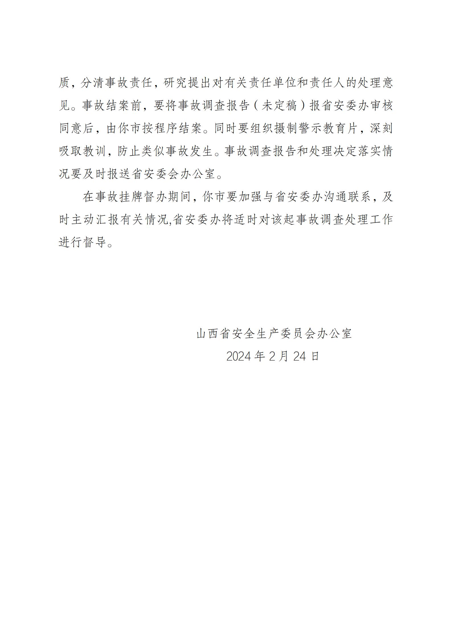 根据《国务院关于进一步加强企业安全生产工作的通知》《山西省较大事故查处挂牌督办办法》等有关规定要求,山西省安委办决定对该起事故查处实行挂牌督办。要求吕梁市依据有关法律法规和规定,组织进行事故调查,查明事故原因,认定事故性质,分清事故责任,研究提出对有关责任单位和责任人的处理意见。事故结案前,要将事故调查报告报山西省安委办审核同意后,由吕梁市按程序结案。同时要组织摄制警示教育片,深刻吸取教训,防止类似事故发生。事故调查报告和处理决定落实情况要及时报送山西省安委办。