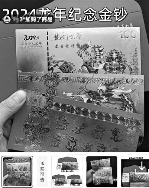 一些直播间里,正在兜售“足金”“足银”类的龙年纪念钞。这些纪念钞,乍一看外形与钱币相差不大,在金银材质的衬托下显得很高大上。记者发现,这些“纪念钞”售价通常比券面所标数字低上一两元,例如标着100的,多售价98元、99元。