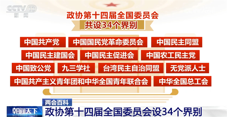 政协第十四届全国委员会共设34个界别,分别是:中国共产党、中国国民党革命委员会、中国民主同盟、中国民主建国会、中国民主促进会、中国农工民主党、中国致公党、九三学社、台湾民主自治同盟、无党派人士等。