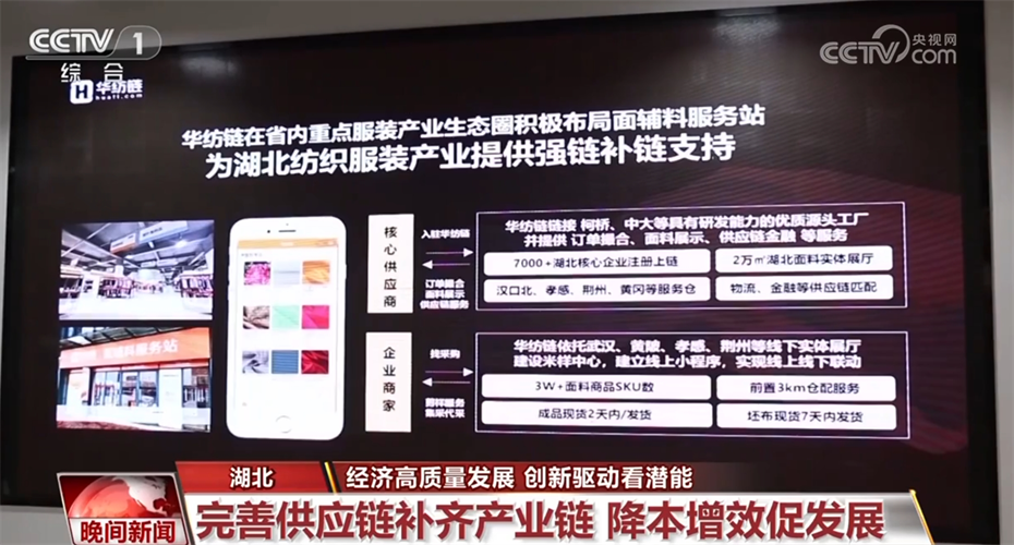 这个像超市一样的“布码头”是湖北省积极融入全国统一大市场的体现之一。2023年,湖北省首个由民营企业牵头、国企参与组建的供应链服务平台华纺链落户汉口北,提供在线采购、智慧物流、智能仓储等一体化综合供应链服务平台,囊括7000多家企业,涵盖牛仔布、缝纫线、羽绒服等多个细分领域。