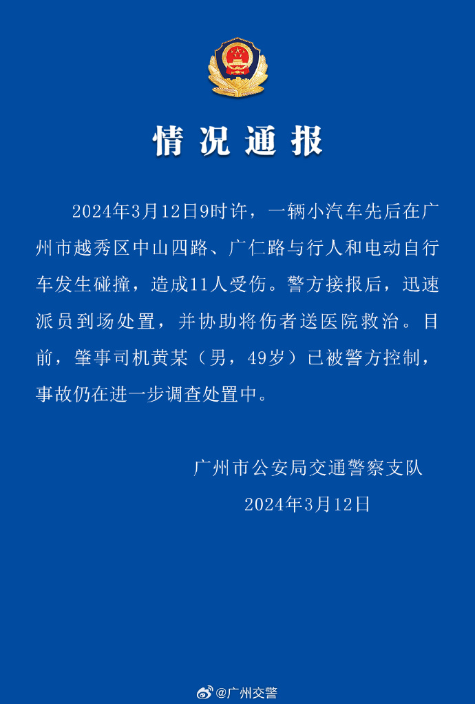 央视网消息:广州市公安局交通警察支队发布情况通报,2024年3月12日9时许,一辆小汽车先后在广州市越秀区中山四路、广仁路与行人和电动自行车发生碰撞,造成11人受伤。警方接报后,迅速派员到场处置,并协助将伤者送医院救治。目前,肇事司机黄某(男,49岁)已被警方控制,事故仍在进一步调查处置中。