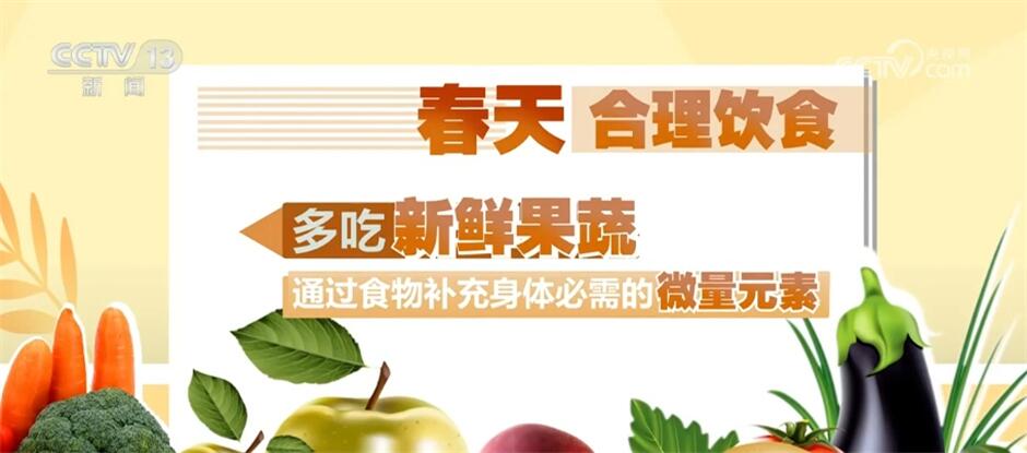 此外,春天要合理饮食,多吃新鲜果蔬,通过食物补充身体必需的微量元素,要吃肉、蛋、奶等优质蛋白,保证人体所需。晚餐要清淡、少量,吃得过饱以及摄入油腻食物等容易增加肠胃负担,造成夜晚入睡困难。