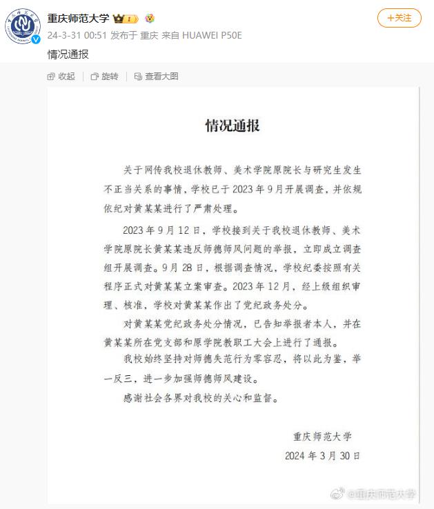 央视网消息:3月31日凌晨,@重庆师范大学 发布情况通报:关于网传该校退休教师、美术学院原院长与研究生发生不正当关系的事情,学校已于2023年9月开展调查,并依规依纪对黄某某进行了严肃处理。