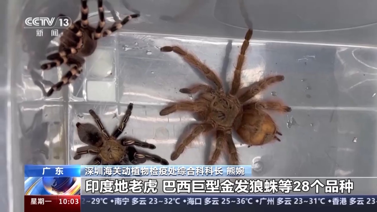 深圳海关动植物检疫处综合科科长 熊婉:查验关员在对转运快件开展监管时,发现一票申报品名为“相机三脚架”的快件包裹机检图像异常,不符合相机三脚架的图像特征,随后进行了开包查验。经过专业机构鉴定,这批活体蜘蛛是墨西哥金背红尾蛛、印度地老虎、巨人伪鸣蛛、巴西巨型金发狼蛛等28个品种。