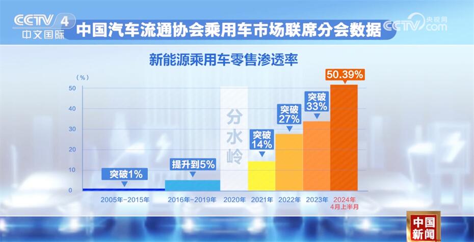 央视网消息:记者从中国汽车流通协会相关部门了解到,4月上半月,我国新能源乘用车零售渗透率首次突破50%。
