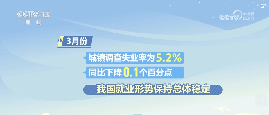 据介绍,2024年1—3月,累计实现城镇新增就业303万人,同比增加6万人。3月份,城镇调查失业率为5.2%,同比下降0.1个百分点。我国就业形势保持总体稳定。
