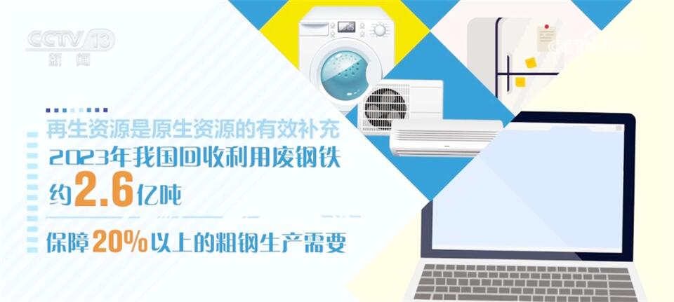 专家表示,再生资源是原生资源的有效补充。2023年我国回收利用废钢铁约2.6亿吨,保障了20%以上的粗钢生产需要。截至目前,我国冰箱、洗衣机、空调等家电保有量已超过30亿台。每年有1亿至1.2亿台废旧家电被淘汰,如果这些废旧家电处置不好将危害我们的环境。