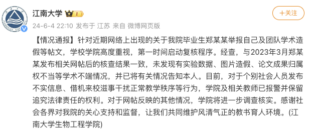 央视网消息:据@江南大学 微博通报,针对近期网络上出现的关于生物工程学院毕业生郑某某举报自己及团队学术造假等帖文,学校学院高度重视,第一时间启动复核程序。经查,与2023年3月郑某某发布相关网帖后的核查结果一致,未发现有实验数据、图片造假、论文成果归属权不当等学术不端情况,并已将有关情况告知本人。目前,对于个别社会人员发布不实信息、借机来校滋事干扰正常教学秩序等行为,学院及相关教师已报警并保留追究法律责任的权利。对于网帖反映的其他情况,学院将进一步调查核实。