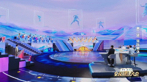 《全民健康大会》创设绚丽百变的视觉场景。选手在“人体山河”中探索健康奥秘、在“绿色氧吧”中参与运动、在“群山之巅”习练太极拳……