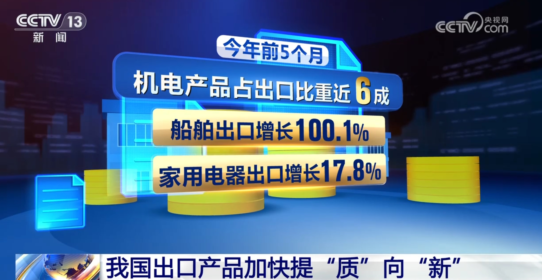 不久前发布的今年前5个月货物贸易进出口数据中,技术含量和附加值高的机电产品贡献了主要增量。其中,机电产品占出口比重近6成,我国具有优势的船舶、家用电器出口分别增长100.1%和17.8%。