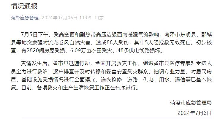 央视网消息:山东省菏泽市应急管理局7月6日发布情况通报,7月5日下午,受高空槽和副热带高压边缘西南暖湿气流影响,菏泽市东明县、鄄城县等地突发强对流龙卷风自然灾害,造成88人受伤,其中5人经抢救无效死亡。初步核查,有2820间房屋受损、6.09万亩农田受灾、48条供电线路损坏。