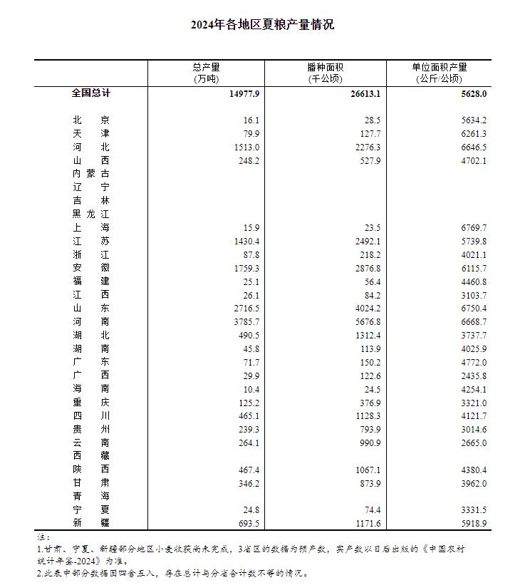 央视网消息:国家统计局7月12日公布数据显示,根据对全国25个夏粮生产省(区、市)的调查,2024年全国夏粮播种面积、单位面积产量、总产量如下: