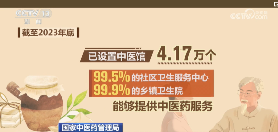 数据显示,截至2023年底,已设置中医馆4.17万个,99.5%的社区卫生服务中心、99.9%的乡镇卫生院能够提供中医药服务。自2022年以来,已支持1043个县级中医院建设中医特色优势专科。通过县级中医医院“两专科一中心”项目,依托县级中医医院开展县域中医药适宜技术推广中心建设,加快形成覆盖县、乡、村医疗卫生机构的中医药适宜技术推广网络,持续提升了乡村医疗卫生机构中医药诊疗能力。