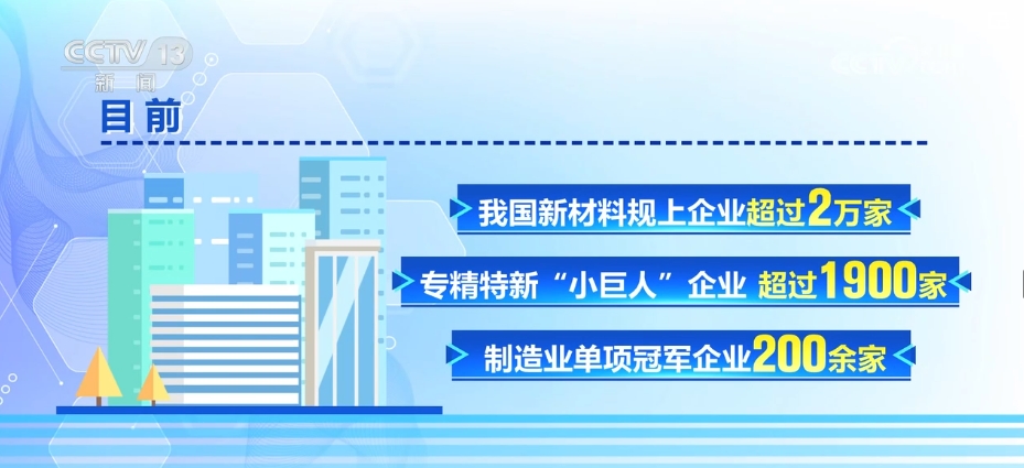 工业和信息化部统计数据显示,目前,我国新材料规上企业超过2万家、专精特新“小巨人”企业超过1900家、制造业单项冠军企业200余家。此外,新材料领域培育形成了7个国家先进制造业集群,成为推动区域经济增长的“加速器”。