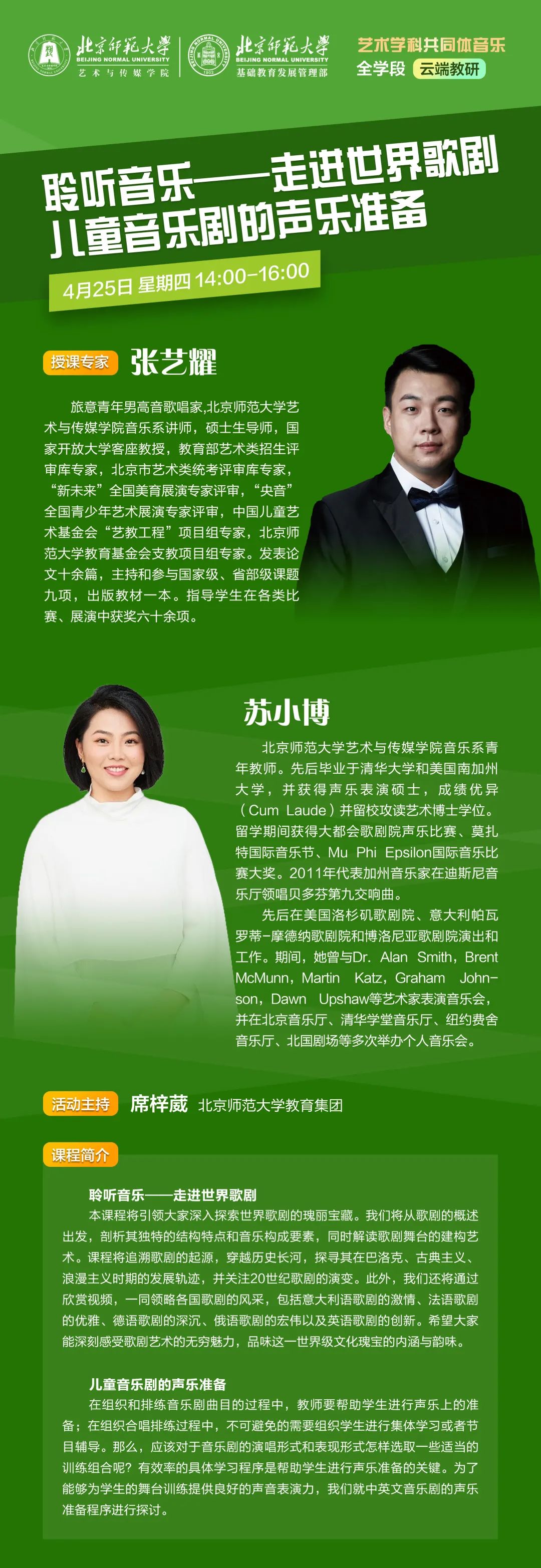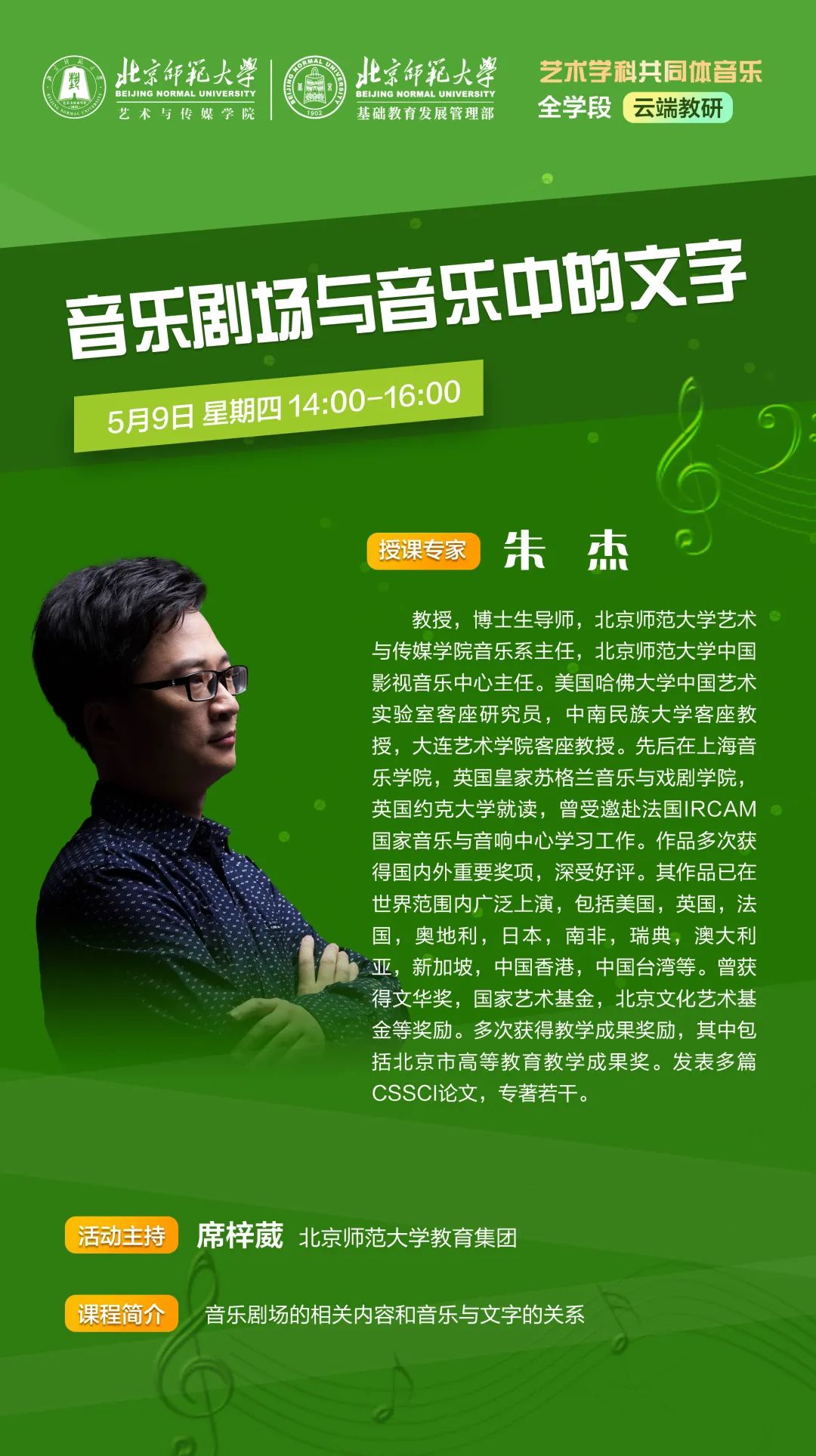 在全学段的广阔视野下,通过云端教研的创新平台,音乐教育精英汇聚一堂,共襄盛举。艺术与传媒学院副院长、艺术学科共同体秘书长张璐副教授以美育目标为引领,深入探索音乐教育的理论与实践新境;中国音乐学院刘沛教授精研艺术课程标准之精髓,无私分享教学实施的重点与策略。艺术与传媒学院音乐系张艺耀、苏小博两位老师携手,引领基础教育艺术教师“聆听音乐”,步入世界歌剧与儿童音乐剧的殿堂,细致解析声乐准备的艺术奥秘。艺术与传媒学院音乐系主任朱杰教授以独特的视角,解析音乐剧场之魅力,并探讨音乐中文字的深刻意蕴。这一系列云端教研活动,无疑为音乐教育领域注入了新的活力与灵感,共同推动着音乐教育事业的蓬勃发展。
