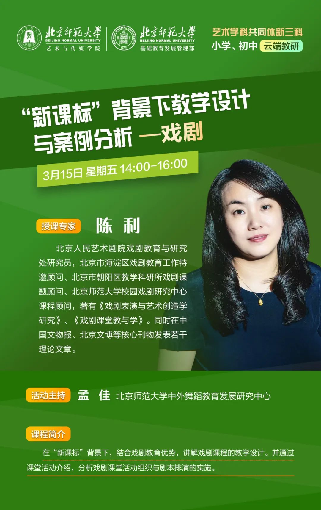 在《2022年版义务教育课程方案和课程标准》中,明确提出舞蹈、戏剧(含戏曲)、影视(含数字媒体艺术)是义务教育阶段发展的重要组成部分。新三科云端教研由6位专家组成教学团队,依托北京师范大学丰厚的人文积淀,以国家义务教育艺术课程标准修订组专家领衔,联合国内外著名专家、学者、名师组建的师资队伍,开展“美学+艺术”“理论+实践”“教学+育人”等综合实践探索。通过助力附校平台一线艺术教育工作的一线教师、教研员,并产生辐射力量,提升广大中小学艺术教师的综合能力,重点培养新三科艺术教师的师资队伍,从而促进我国艺术教育事业的可持续发展。