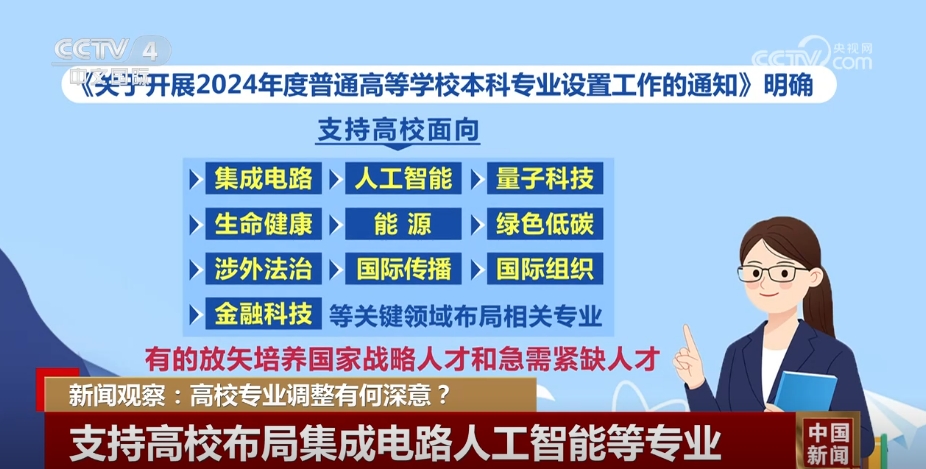 《通知》明确,支持高校面向集成电路、人工智能、量子科技、生命健康、能源、绿色低碳、涉外法治、国际传播、国际组织、金融科技等关键领域布局相关专业,有的放矢培养国家战略人才和急需紧缺人才。支持高校深化新工科、新医科、新农科、新文科建设,对现有专业进行改造,培育交叉融合的新兴专业,打造特色优势专业集群。