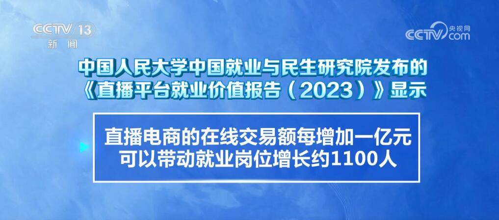 中国人民大学中国就业与民生研究院发布的《直播平台就业价值报告(2023)》显示,直播电商的在线交易额每增加一亿元,可以带动就业岗位增长约1100人,直播电商不仅催生出30多种新职业,还带动产业链上下游提供了大量就业机会。
