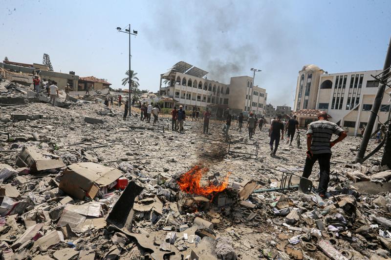 7月27日,在加沙地带中部城市代尔拜拉赫,人们聚集在以军袭击现场附近。 新华社 发(里泽克·阿卜杜勒贾瓦德 摄)