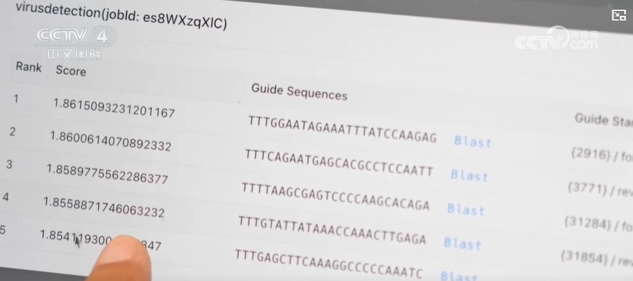 之江实验室生命科学计算研究中心工程专家 郭玲:我们把病毒的DNA喂给“AI”模型之后,它会在计算机里进行高速的运算和筛选,从而筛选出五条最优的结果。生物学家只要对这五条最优的结果进行实验验证,就可以得到性能非常好的检测试剂。