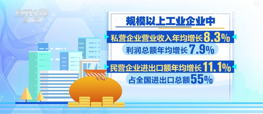 党的十八大以来,规模以上工业企业中私营企业营业收入年均增长8.3%,利润总额年均增长7.9%,民营企业进出口额年均增长11.1%,占全国进出口总额55%。
