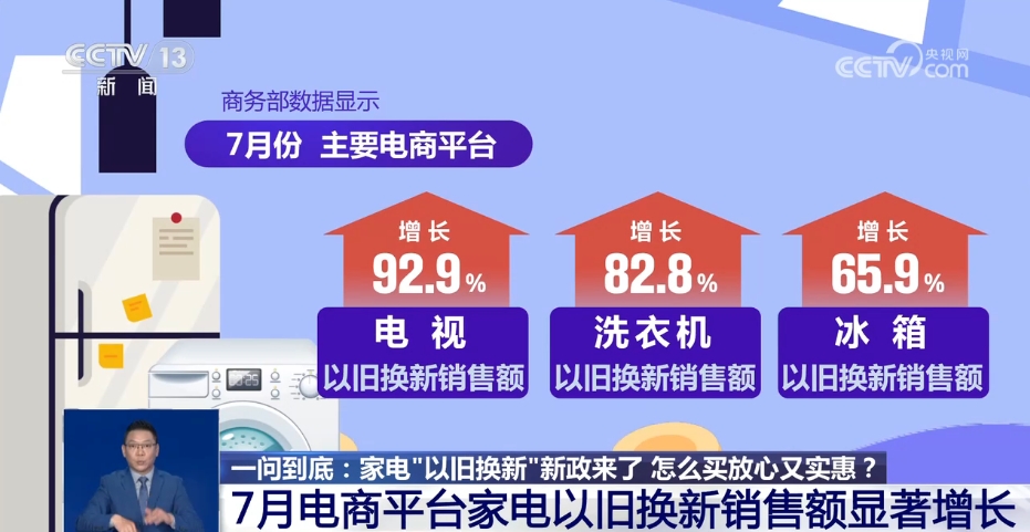 从今年3月国家出台家电以旧换新政策以来,各地都推出了优惠活动吸引消费者。其中,电商平台多元协同,支持40多万种商品以旧换新、300多个品类同步回收。商务部数据显示,7月份,主要电商平台电视、洗衣机、冰箱以旧换新销售额增长92.9%、82.8%和65.9%。