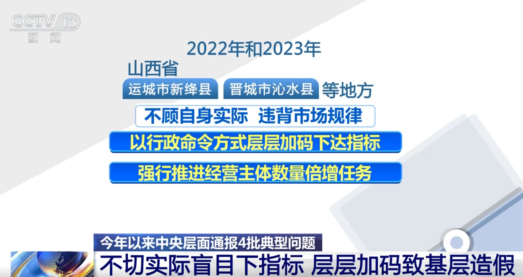 有的地方不切实际盲目下指标、定任务,层层加码导致基层数据造假。比如,2022年和2023年,山西省运城市新绛县、晋城市沁水县等地方不顾自身实际、违背市场规律,以行政命令方式层层加码下达指标,强行推进经营主体数量倍增任务。在上级强推下,部分乡镇(街道)为完成任务、应对考核,采取动员、代办等方式,以群众名义注册一些没有实际经营业务的经营主体进行充数,甚至出现一人注册20多个经营主体的情况,有的在年度考核评比结束后再将一些经营主体注销。