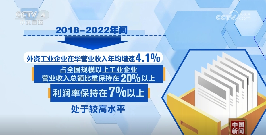 报告指出,跨国公司通过投资中国,在利润收益增长、成本结构和要素配置优化等方面持续受益。2018—2022年间外资工业企业在华营业收入年均增速4.1%,占全国规模以上工业企业营业收入总额比重保持在20%以上,利润率保持在7%以上,处于较高水平。