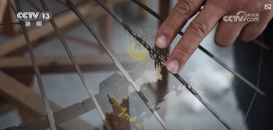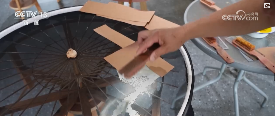 宋志明:刷出来的图案有灵动感,这是其他喷绘、绘画所出不来的效果。特别是在丝绸伞面上来画,通过颜料的雾状,刷花呈现出的效果是独一无二的。