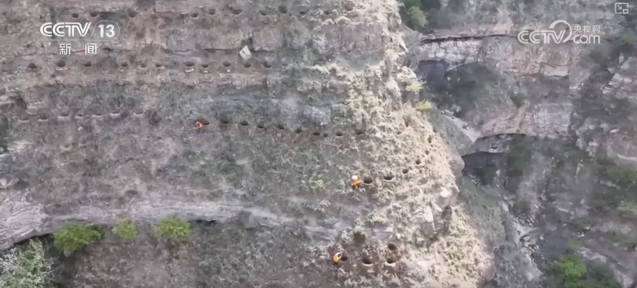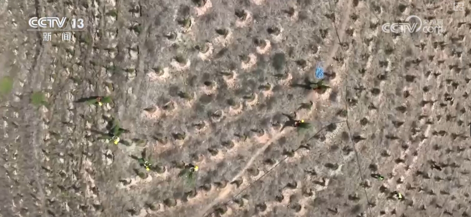 上山没路,无人机挂着树苗飞上去。植树员挂着安全绳从天而降,与山石对抗凿出一个个树坑。