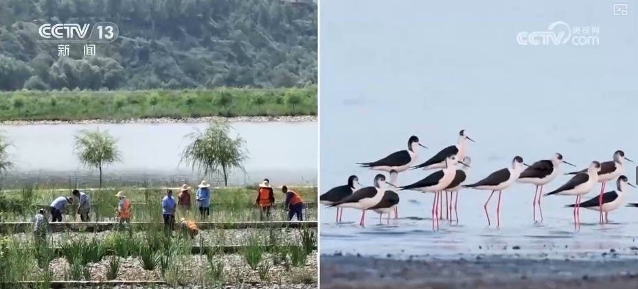 在汾河沿岸,人们正在补种芦苇。水生植物就像水中清道夫,发达的根系能有效吸附水中的污染物,还能为水生生物提供良好的栖息环境。