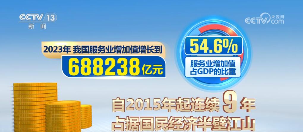 服务业规模不断壮大。1952年,我国服务业增加值为195亿元,1978年增长到905亿元,1953—1978年年均实际增长5.4%,服务业处于辅助地位。随着国家一系列促进服务业发展的政策措施落地显效,新产业、新业态、新模式大量涌现。2023年,我国服务业增加值增长到688238亿元,服务业增加值占GDP的比重达到54.6%,自2015年起连续9年占据国民经济半壁江山。