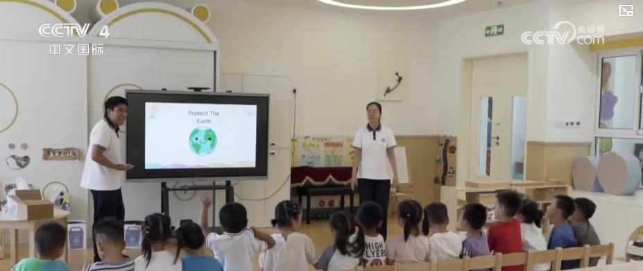 在雄安白塔幼儿园里,美国外教佩雷斯正在教孩子们如何进行垃圾分类。