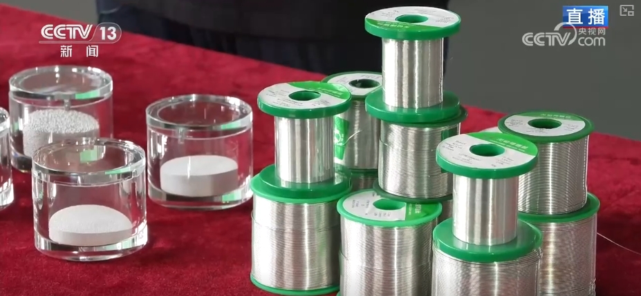 这是一条正在开足马力的现代化锡丝生产线,从这样一个比汽车轮胎还要大的卷轴开始,经过挤压灌装、滚轧拉丝、绕丝包装等程序,最后就变成了这样的小卷轴,每秒钟有3米长的锡丝问世。而且比头发丝还要细的锡丝,里面还填充了助剂,增加它的润湿性和扩展性。除了锡丝,在产业链下游还有其他国际领先产品。这几个瓶子装的都是精深加工锡球产品,直径由大到小顺序排列。比如这个像调料瓶的器皿中有上百万颗焊锡球,与其说是球,其实更像是粉,但都是同等大小、规格、硬度、标准。