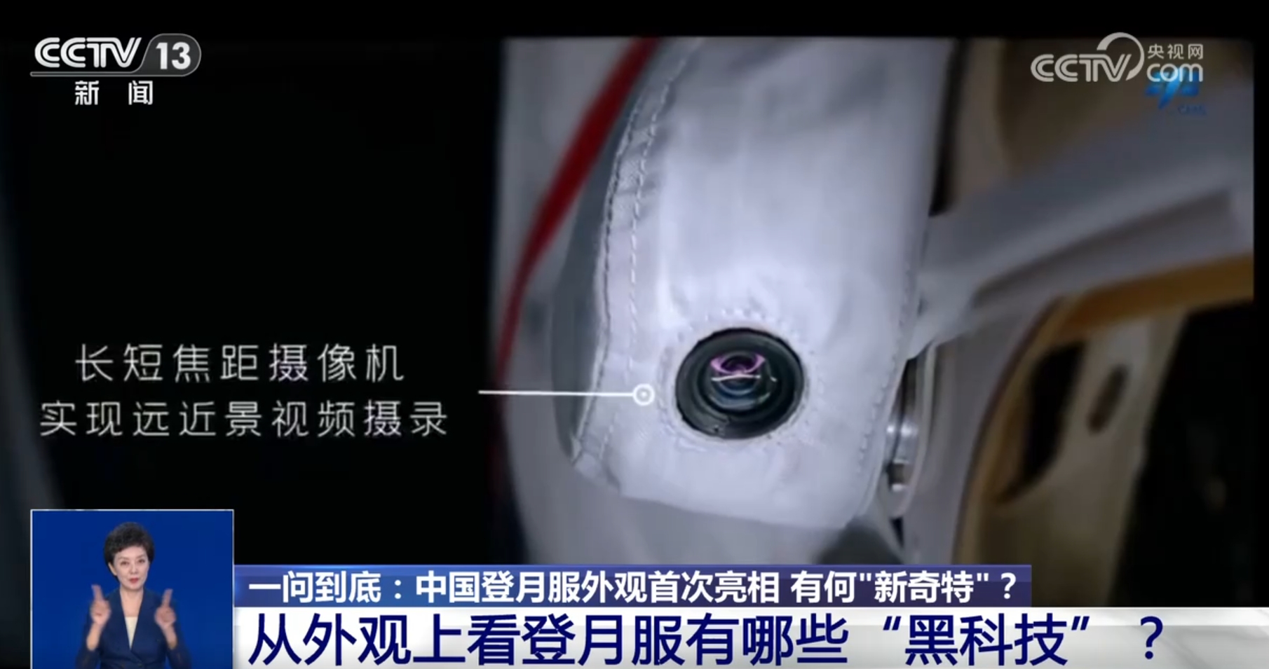 登月服拥有综合防护面料,可有效防护月面热环境及月尘影响。面罩是全景式防眩光面窗,提升视觉工效。头部两侧位置还分别配置了一个长短焦距摄像机,可实现远近景视频摄录。胸前有多功能集成控制台,操作更便捷高效。整体轻量化,适应月面活动需求,低重力环境关节配置,人服活动能力增强。也就是说,可蹲可弯腰,科技感十足。